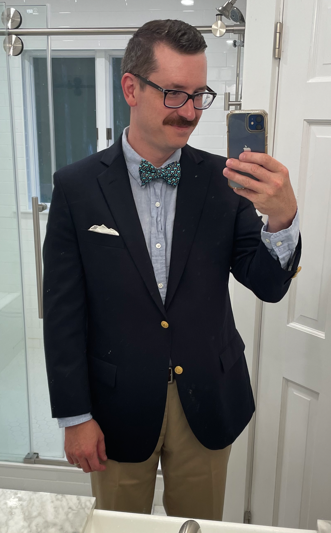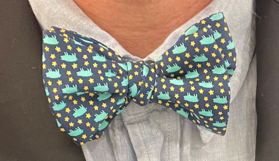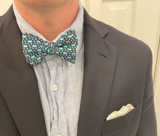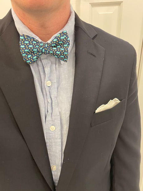 My tie was a bow-tie with small blue pigs on it. I decided to wear a bow-tie because the shirt I was wearing actually doesn’t support a regular tie very well given its short collar points. With a bow-tie, however, the collar points sit comfortably behind the “wings” of the tie so that they aren’t visible.