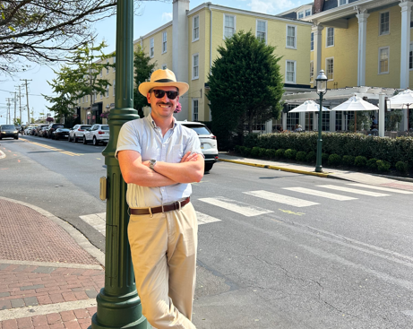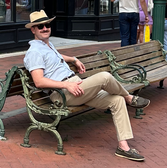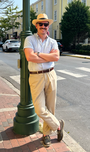 For my outfit, since we were sitting outside in the heat, I knew a jacket would be too hot but I still wanted to look nice. I opted for my short-sleeved, button-down collar, seersucker shirt from Brooks Brothers.