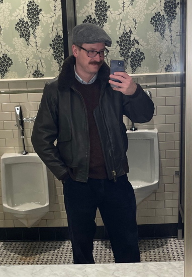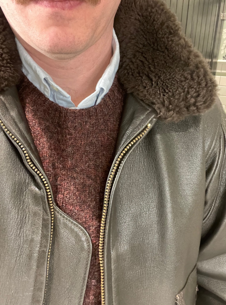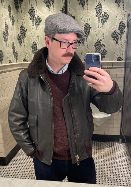 Instead of a jacket, I wore a thick, burgundy, wool sweater from Brooks Brothers my wife got me as a Christmas gift a couple years ago. I also wore navy, corduroy pants, a leather flight jacket and a tweed cap.